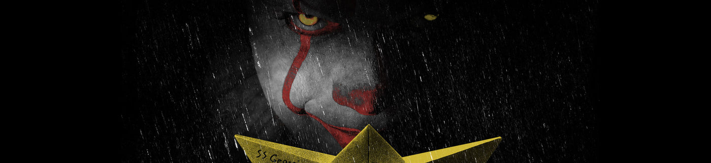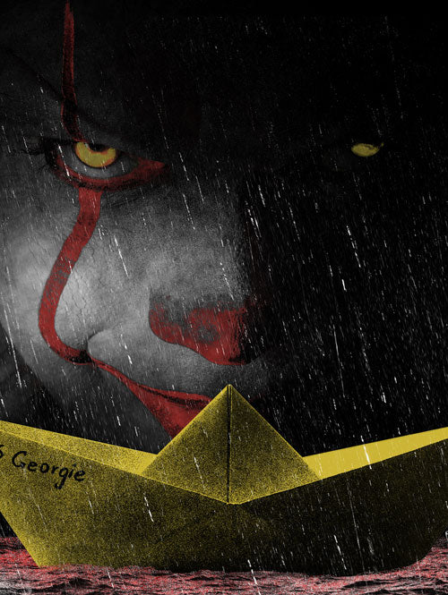 In the flicker of a streetlight, the storm drain gurgles. A red balloon drifts by, snagging on the grate. Below, two yellow eyes blink open - hungry and patient. Pennywise smiles in the darkness, whispering your name...